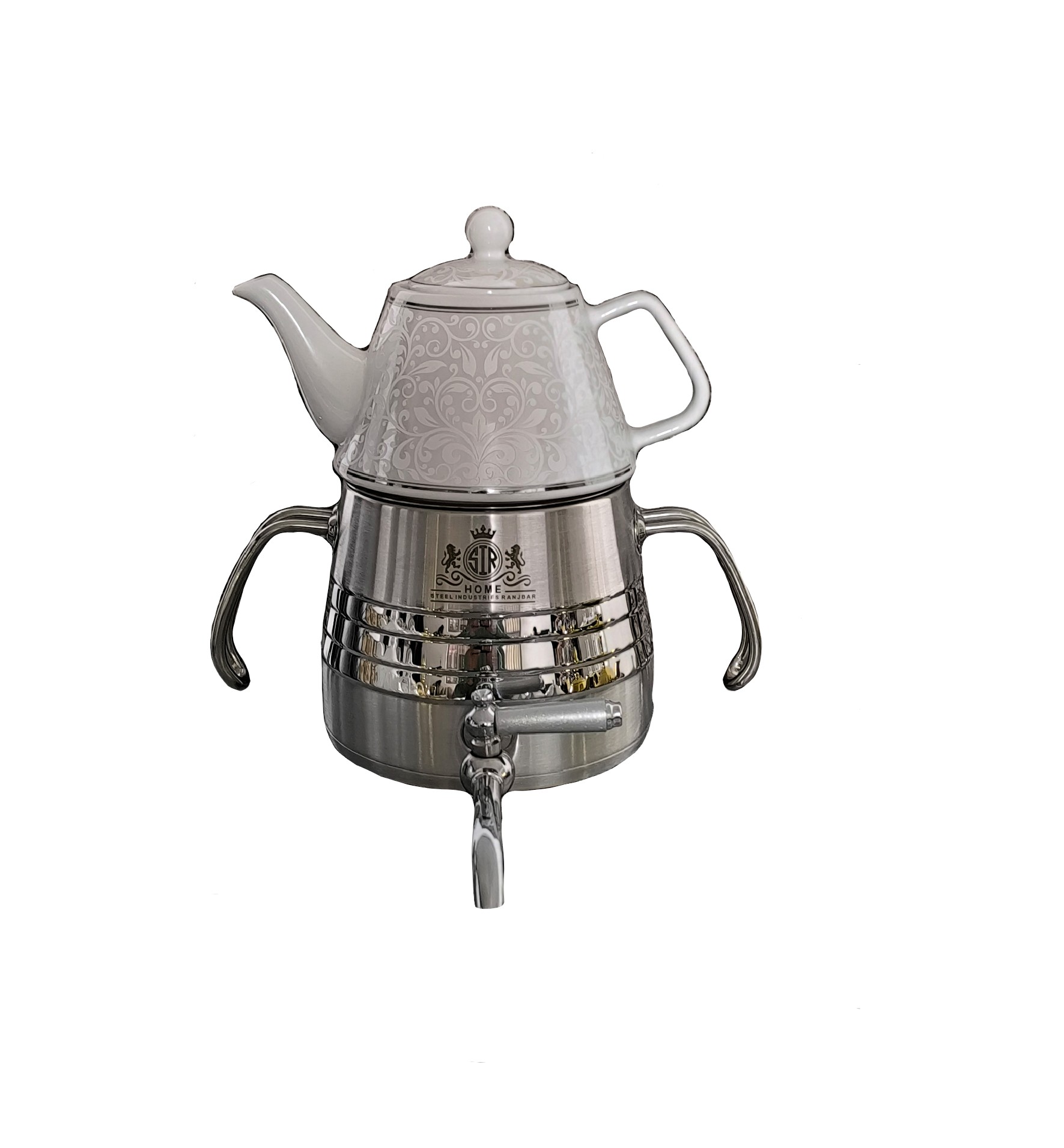 جنس بدنه کتری استیل با ضخامت 0/8mm با تکنولوژی کف چدن سه لایه که از دو لایه استیل و در بین آن یک لایه آلومینیوم ساخته شده است که این مزیت باعث صرفه جوی در مصرف انرژی می شود که در کمترین زمان ممکن آب داخل کتری را به نقطه جوش می رساند تا مدت زیادی حدود یک ساعت آب را داغ نگه می دارد مهجز به درب سوپاپ دار برای مواقعی که کتری بدون قوری استفاده می شود درب سوپاپ دار باعث زود تر داغ شدن آب کتری می شود وهنگام استفاده با قوری سوپاپ روی درب بخار آب کتری را به زیر قوری هدایت میکند و در حالت دم آوری قوری قرار می گیرد همچنین دسته کتری از جنس استیل 304 ضد زنگ ساخت ترکیه می باشد که روی کتری نصب شده است جنس قوری چینی که به روش PVD رنگ کوره ای شده است که سبب مقاومت بیشتر رنگ در برابر حرارت شده است
