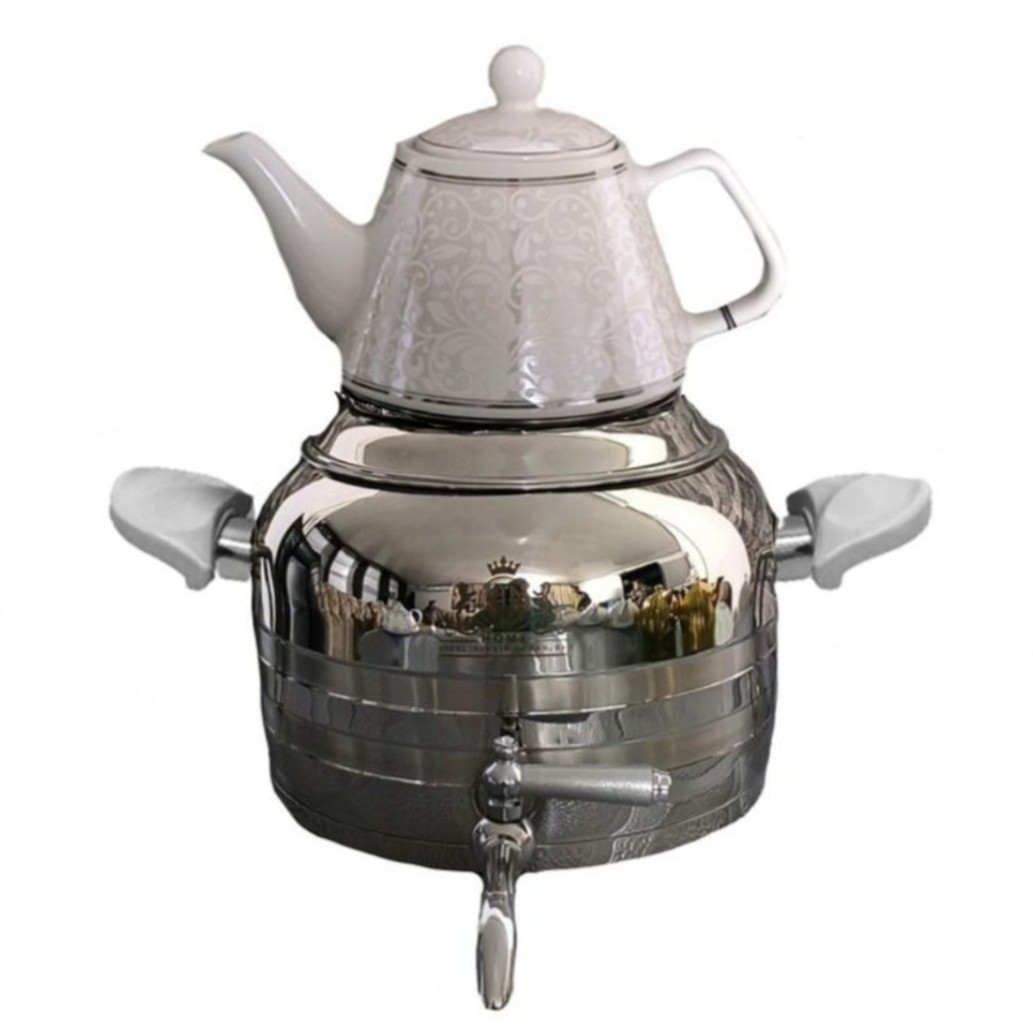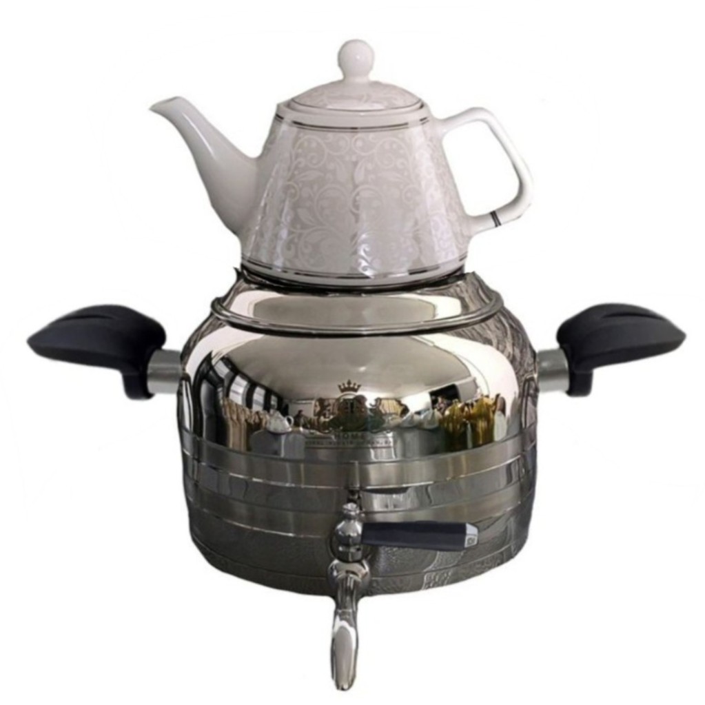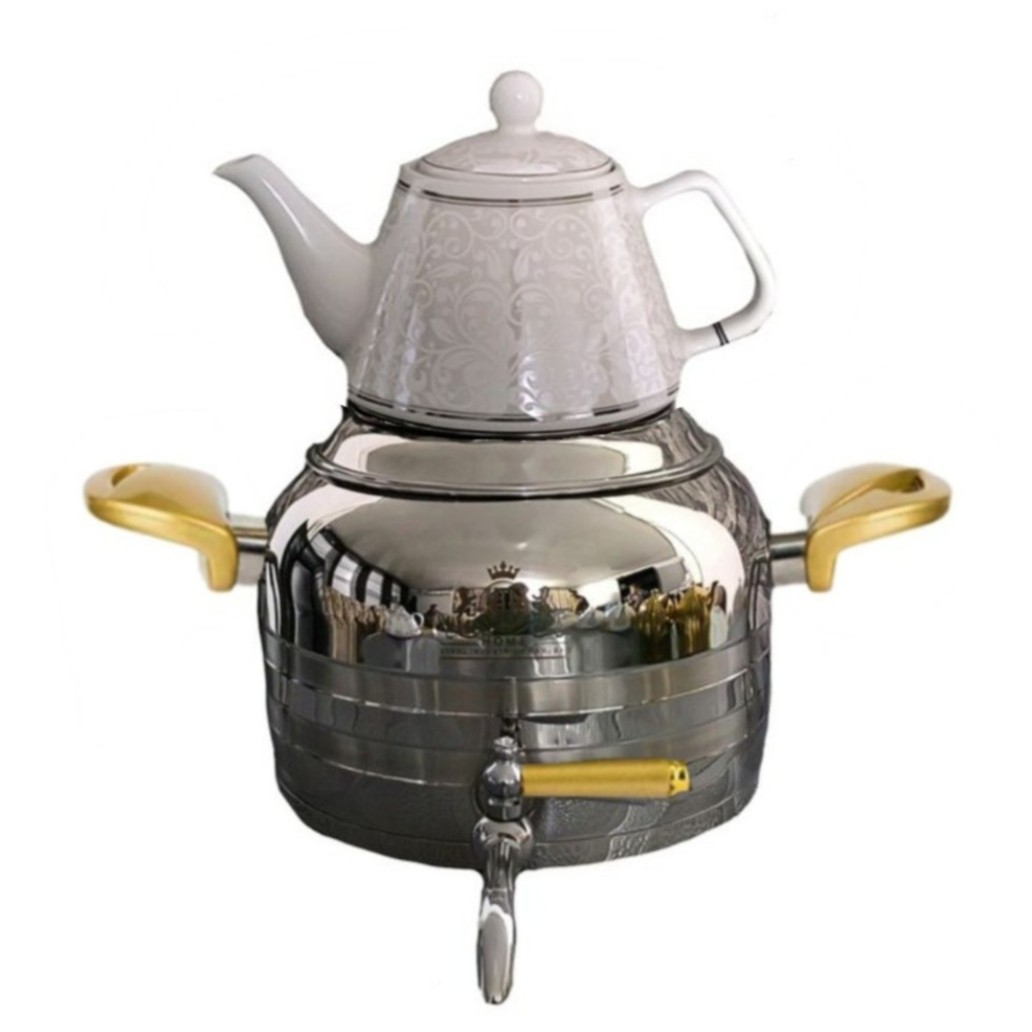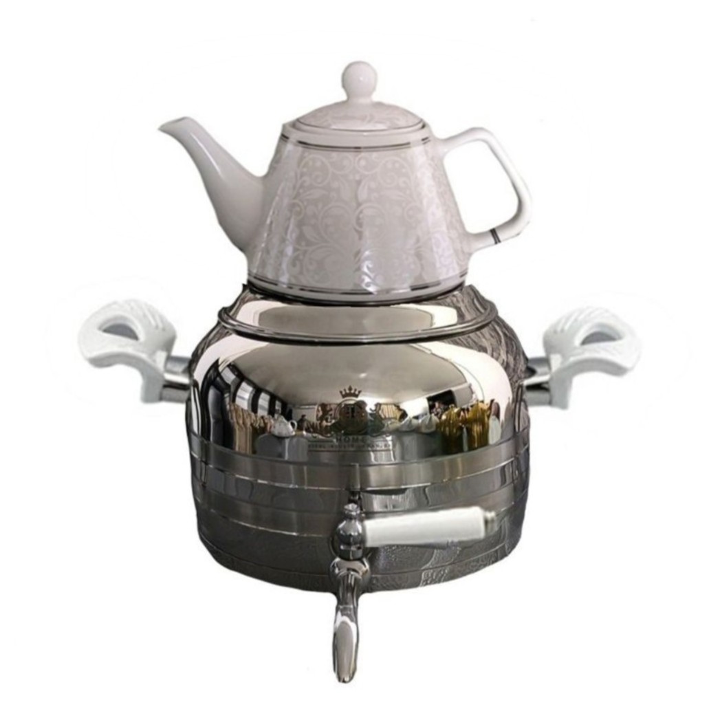 جنس بدنه کتری استیل با ضخامت 0/8mm با تکنولوژی کف چدن سه لایه که از دو لایه استیل و در بین آن یک لایه آلومینیوم ساخته شده است که این مزیت باعث صرفه جوی در مصرف انرژی می شود که در کمترین زمان ممکن آب داخل کتری را به نقطه جوش می رساند تا مدت زیادی حدود یک ساعت آب را داغ نگه می دارد مهجز به درب سوپاپ دار برای مواقعی که کتری بدون قوری استفاده می شود درب سوپاپ دار باعث زود تر داغ شدن آب کتری می شود وهمنگام استفاده با قوری سوپاپ روی درب بخار آب کتری را به زیر قوری هدایت میکند و در حالت دم آوری قوری قرار می گیرد .جنس قوری چینی که به روش PVD رنگ کوره ای شده است که سبب مقاومت بیشتر رنگ در برابر حرارت شده است .همچنین دسته کتری از نوع باکالیت نسوز و در رنگ های سفید .صورتی .طلایی .نقره ای. و مشکی قابل عرضه می باشد.