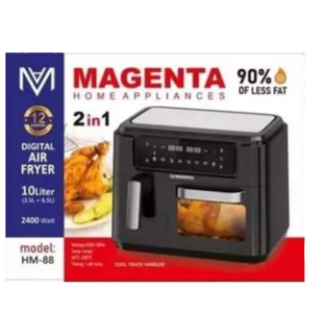 شرکت مگنتا برای طراحی و شکل ظاهری سرخ کن بدون روغن دوقلو جدید خود از زبان طراحی مدرن و مینیمال استفاده کرده که می تواند رضایت طیف وسیعی از مخاطبان خود را جلب نماید.جنس بدنه این سرخ کن از پلاستیک ساخته شده که با توجه به تکنولوژی های به کار رفته اکثر بدنه خارجی و دستگیره سرد بوده و می تواند عمر مفید بالایی داشته باشد.ظرفیت سبد سرخ کن مگنتا دارای گنجایش 3/5 لیتر می باشد. این ظرفیت به کیلوگرم قابلیت پخت و پز 1.5 کیلوگرم مواد غذایی را خواهد داشت. همچنین این سبددارای روکش نچسب با قابلیت جداسازی برای شستشو و نظافت آسان در ماشین ظرفشویی را دارد.سرخ کن مگنتا تولیدی جدید این شرکت هم قابلیت سرخ کن بدون روغن را داشته و هم به لطف طراحی جدید می تواند به عنوان آون توستر نیز به کار گرفته شود. حجم توستر آن 6/5 لیتر است که دارای تعداد 1 سینی برای استفاده های مختلف مانند پخت پیتزا ، مرغ و ماهی ، میگو و سیب زمینی و غیره تعبیه شده است.سرخ کن مگنتا 10 لیتر مدل HM-88 دارای توان مصرفی 2400وات می باشد. این توان مصرفی توسط دو المنت از بالا برای سبد و توستر به صورت جداگانه تامین خواهد شد.10 برنامه پخت و پز از پیش تایین شده می تواند برای تسریع در روند سرخ کردن ، تفت دادن یا گریل کردن کمک نماید. این 10 برنامه به علاوه قابلیت تنظیم دستی دما تا 200 درجه سانتی گراد و تنظیم دستی زمان همگی به لطف یک کنترل پنل دیجیتالی و لمسی قابل دسترسی خواهد بود.از دیگر نکات این سرخ کن مگنتا 10 لیتر مدل HM-88 قابلیت گرم نگهدارنده ، تکنولوژی Rapid Air برای بهترین گردش هوا در اطراف مواد غذایی ، در سبد 3/5 لیتر و در توستر 6/5 لیتر به همراه پایه های ضد لغزش می باشد.