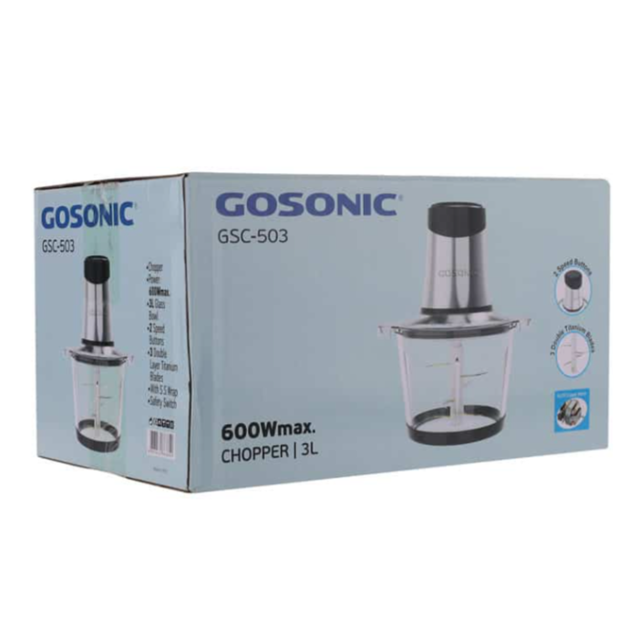 یکی از بهترین خردکن های موجود در بازار با ویژگی های نظیر ، موتور چند سرعته ، تیغه بسیار با کیفیت و کاسه بزرگ برای انجام تمام کارهای روزانه و تهیه غذا ، خردکن 3 لیتری گوسونیک مدل GSC-503 می باشد.جنس کاسه در نظر گرفته شده برای این خردکن گوسونیک مدل GSC-503 از شیشه تهیه شده است. ظرفیت این کاسه 3 لیتر بوده که می تواند برای تهیه یک باره و با سریع مواد غذایی مناسب باشد.توان مصرفی موتور خردکن GSC-503 گوسونیک دارای 600 وات می باشد. این موتور از نوع چند سرعته بوده که می تواند بسته به نیاز کاربرد از سرعت 1 یا 2 بهرهمند شوید.تیغه تعبیه شده برای این خردکن از نوع تیتانیومی بسیار تیز و با دوام ساخته شده است. این تیغه با داشتن 6 پره می تواند انواع مواد غذایی شامل سبزیجات ، سیب زمینی ، پیاز و سیر ، هویچ و کرفس ، مواد پروتئینی و سایر مواد غذایی را به راحتی و در کمترین زمان خرد کند.از دیگر قابلیت های این محصول می توان به قفل ایمنی ، دستگیره مخصوص حمل و نقل و تخلیه مواد غذایی و پایه ضد لغزش اشاره کنیم.