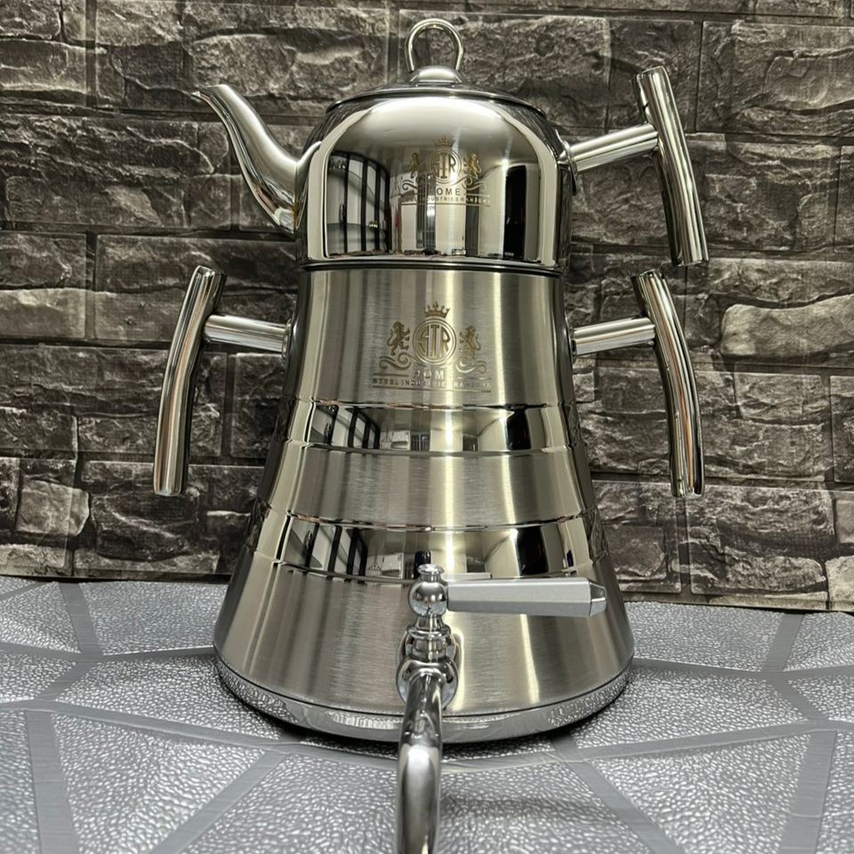 جنس بدنه قوری وکتری استیل با ضخامت 0/8mm که کف کتری با تکنولوژی کف چدن سه لایه که از دو لایه استیل و در بین آن یک لایه آلومینیوم ساخته شده است که این مزیت باعث صرفه جوی در مصرف انرژی می شود که در کمترین زمان ممکن آب داخل کتری را به نقطه جوش می رساند تا مدت زیادی حدود یک ساعت آب را داغ نگه می دارد مهجز به درب سوپاپ دار برای مواقعی که کتری بدون قوری استفاده می شود درب سوپاپ دار باعث زود تر داغ شدن آب کتری می شود وهمنگام استفاده با قوری سوپاپ روی درب بخار آب کتری را به زیر قوری هدایت میکند و در حالت دم آوری قوری قرار می گیرد همچنین دسته کتری از جنس استیل 304 ضد زنگ ساخت ترکیه می باشد که روی کتری نصب شده است که باعث دوام و طول عمر و مقاومت بیشتر در برابر حرارت شده است.
